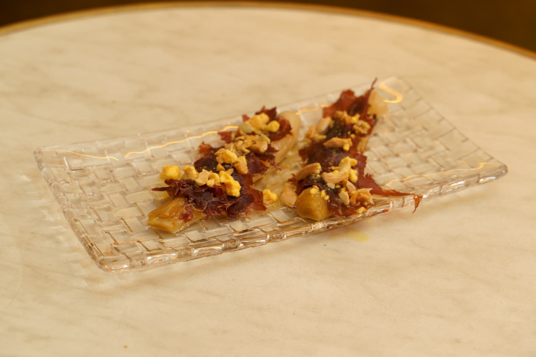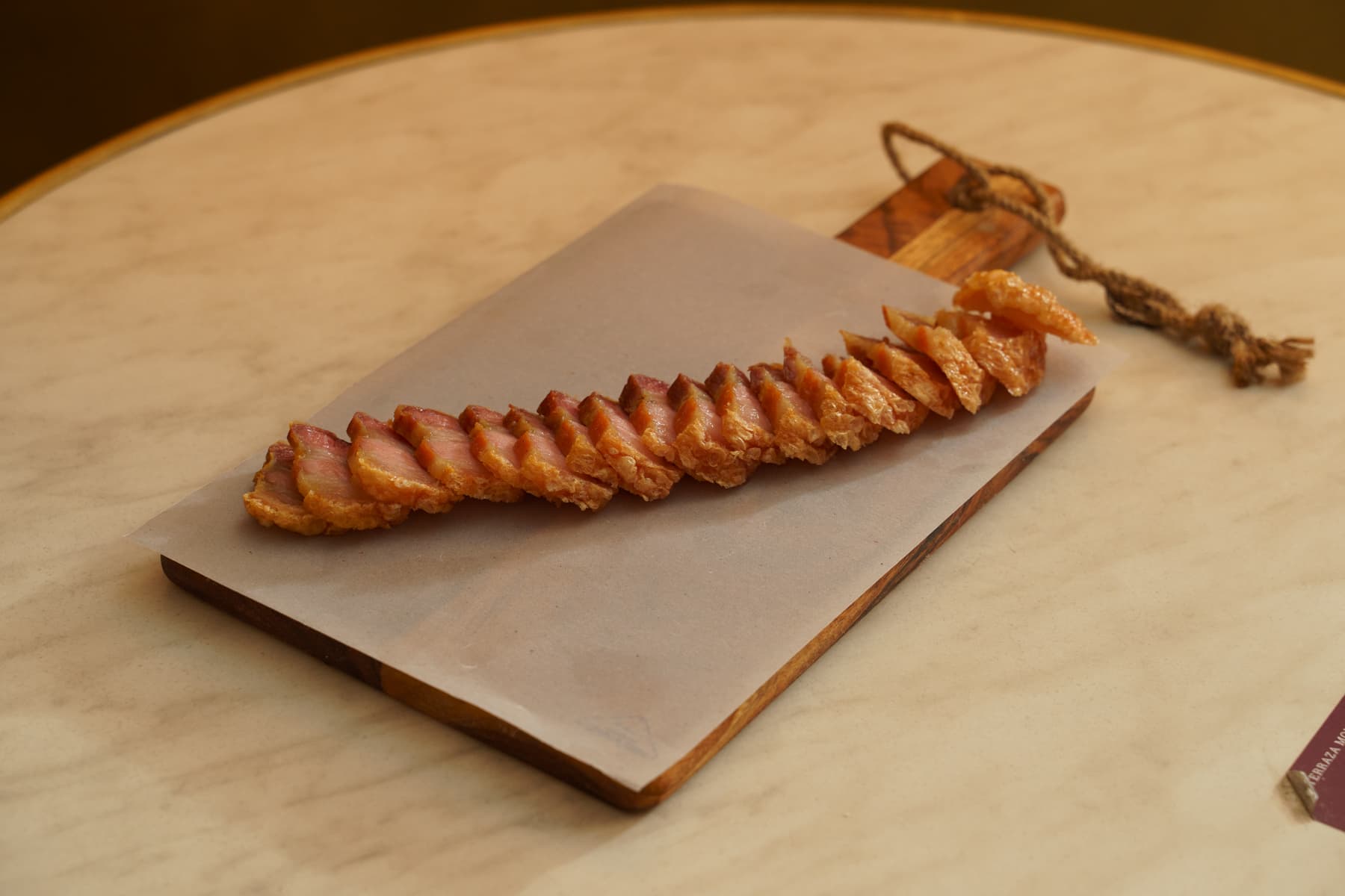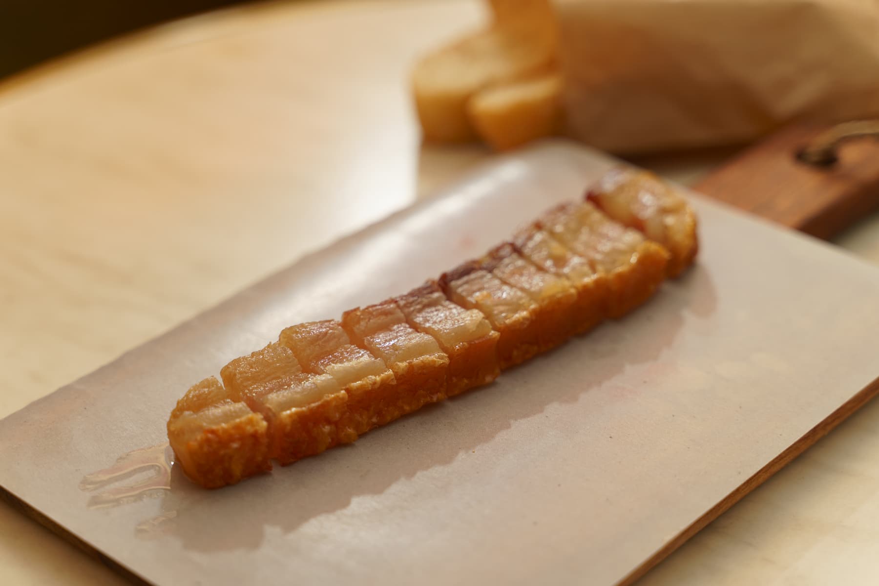 Tira de panceta frita a baja temperatura con corteza crujiente.