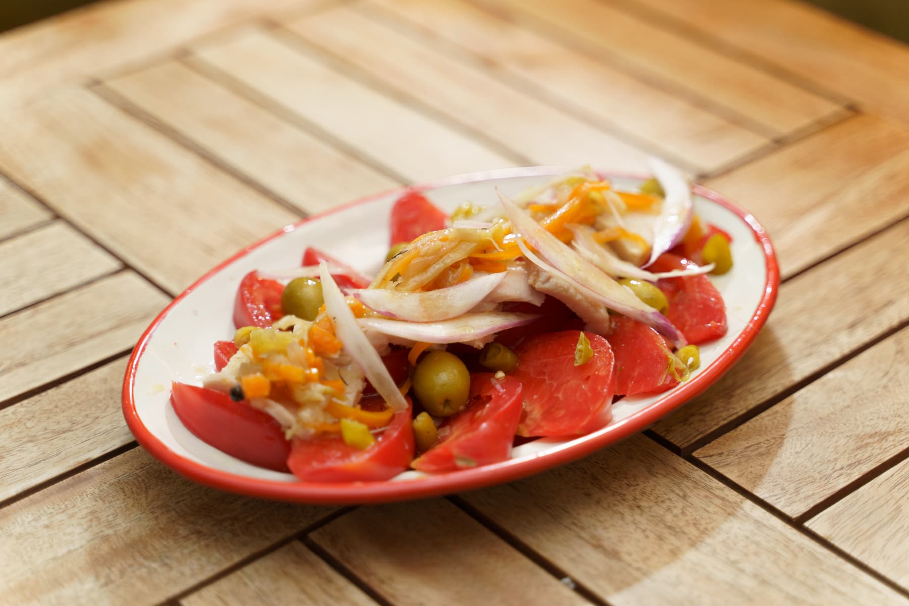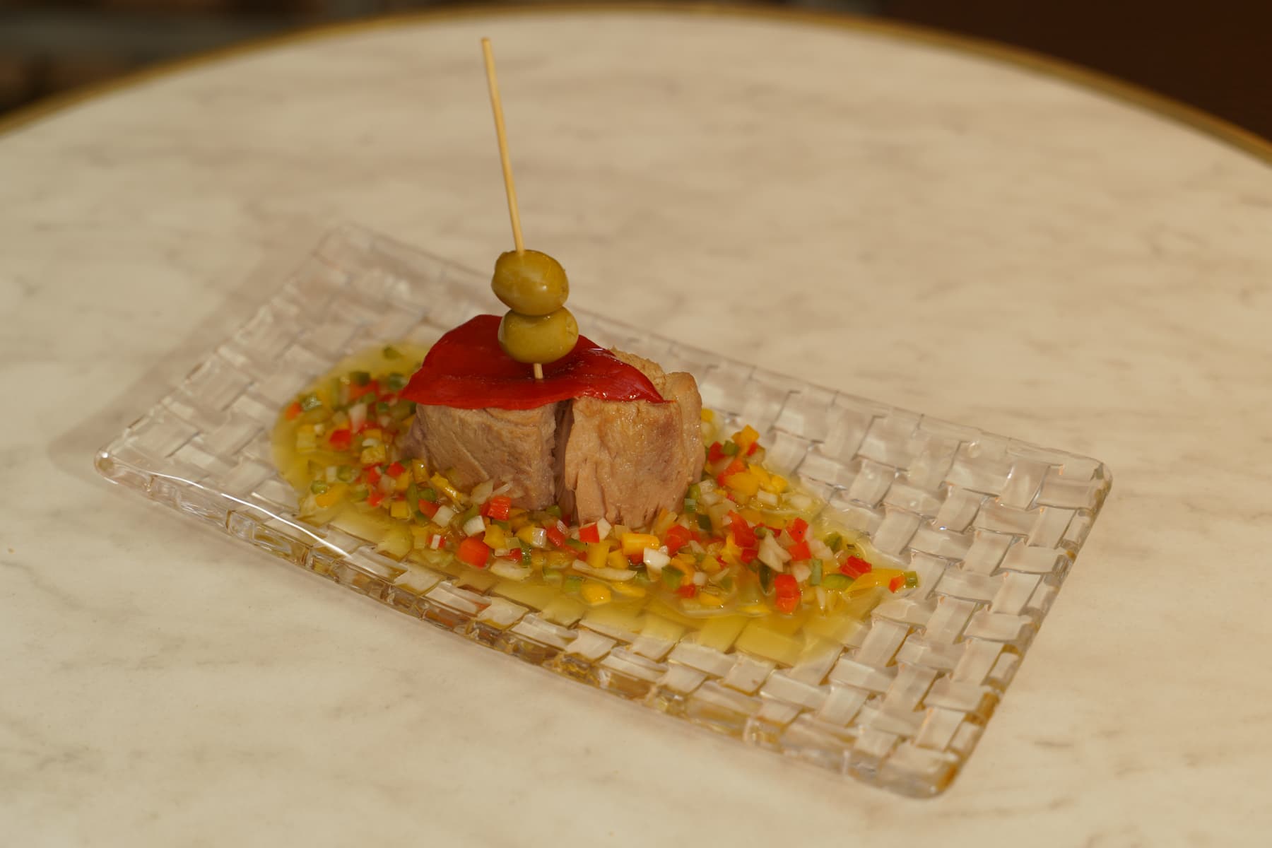 Atún en aceite, aceitunas, pimiento del piquillo, vinagreta de verduras y a.o.v.e.