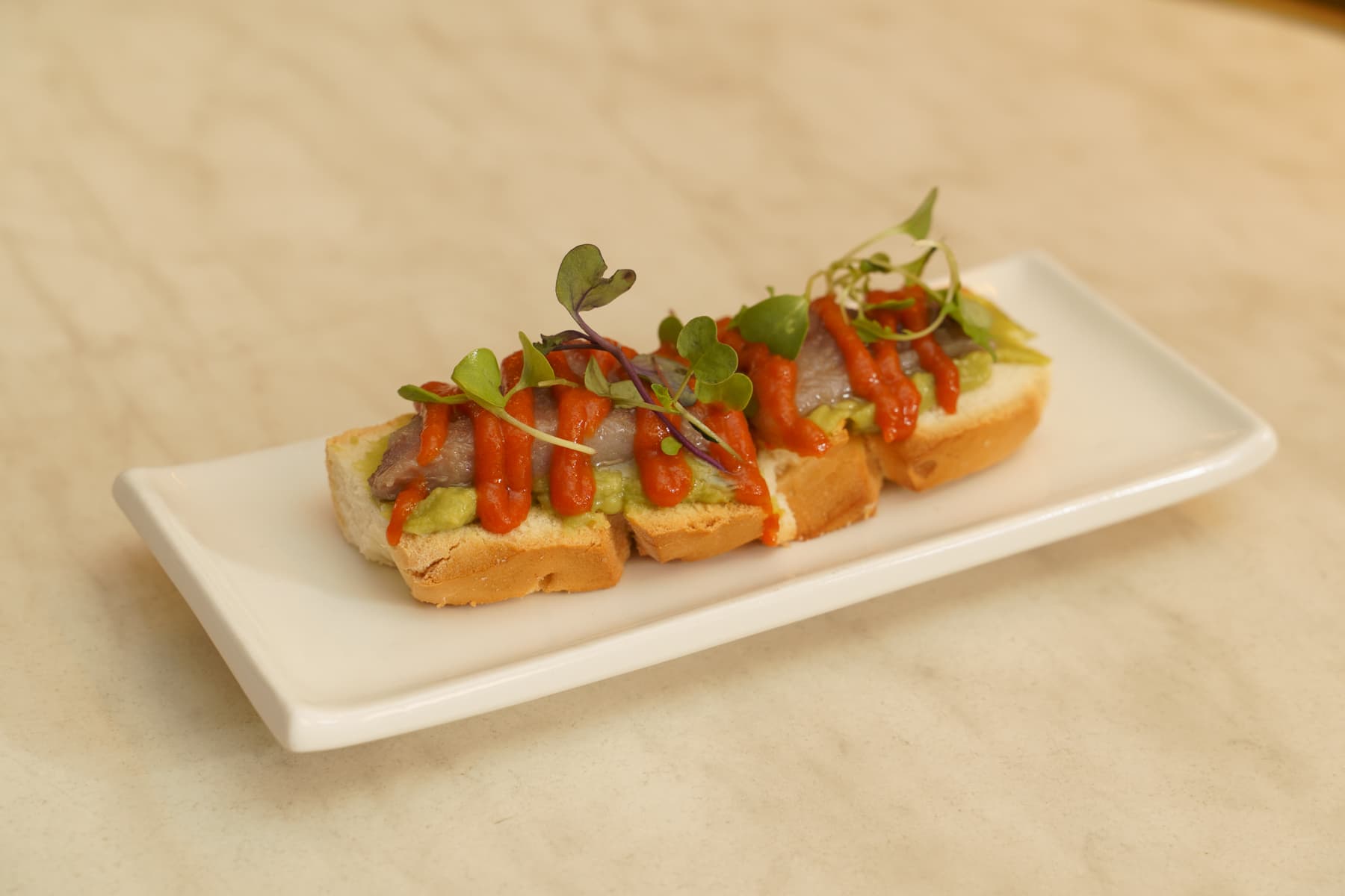 Tosta de pan con base de verduritas escabechadas y mezcla de pollo escabechado al aroma suave de vinagre Xerez y vinagre de sidra con mahonesa de guacamole.