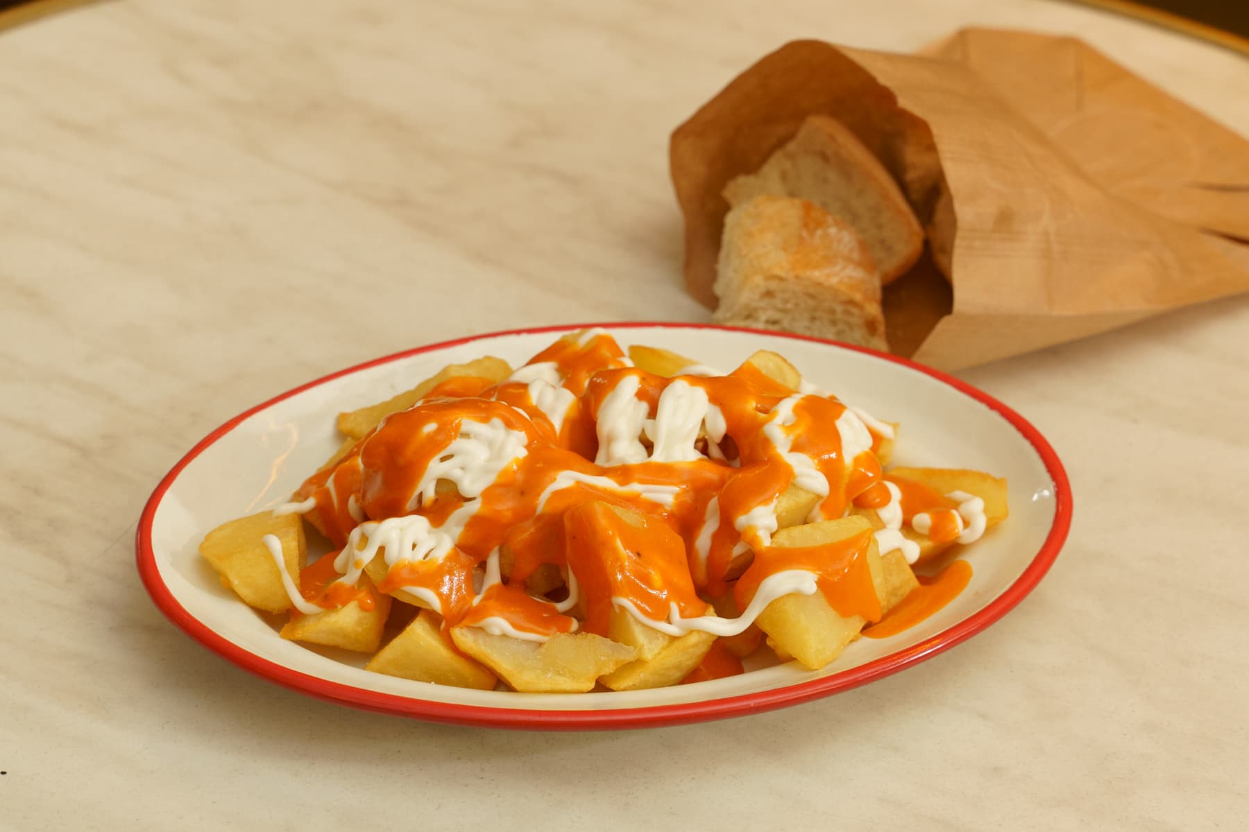 Gajos de patata frita especiada con salsa brava casera hecha a base de mojo picón, tomate frito y mahonesa.